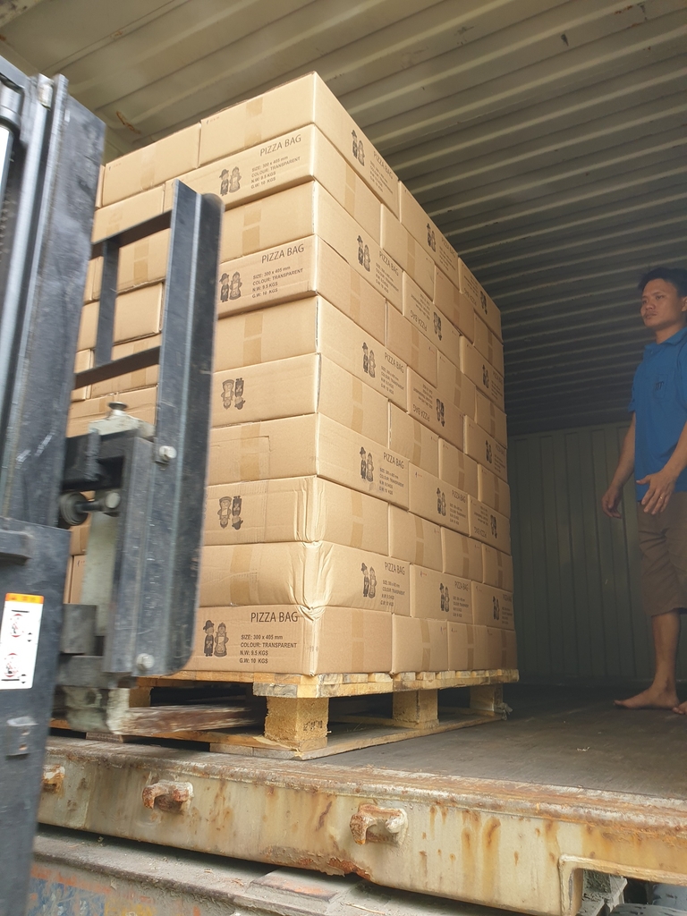 T-shirt bags in boxes on loading